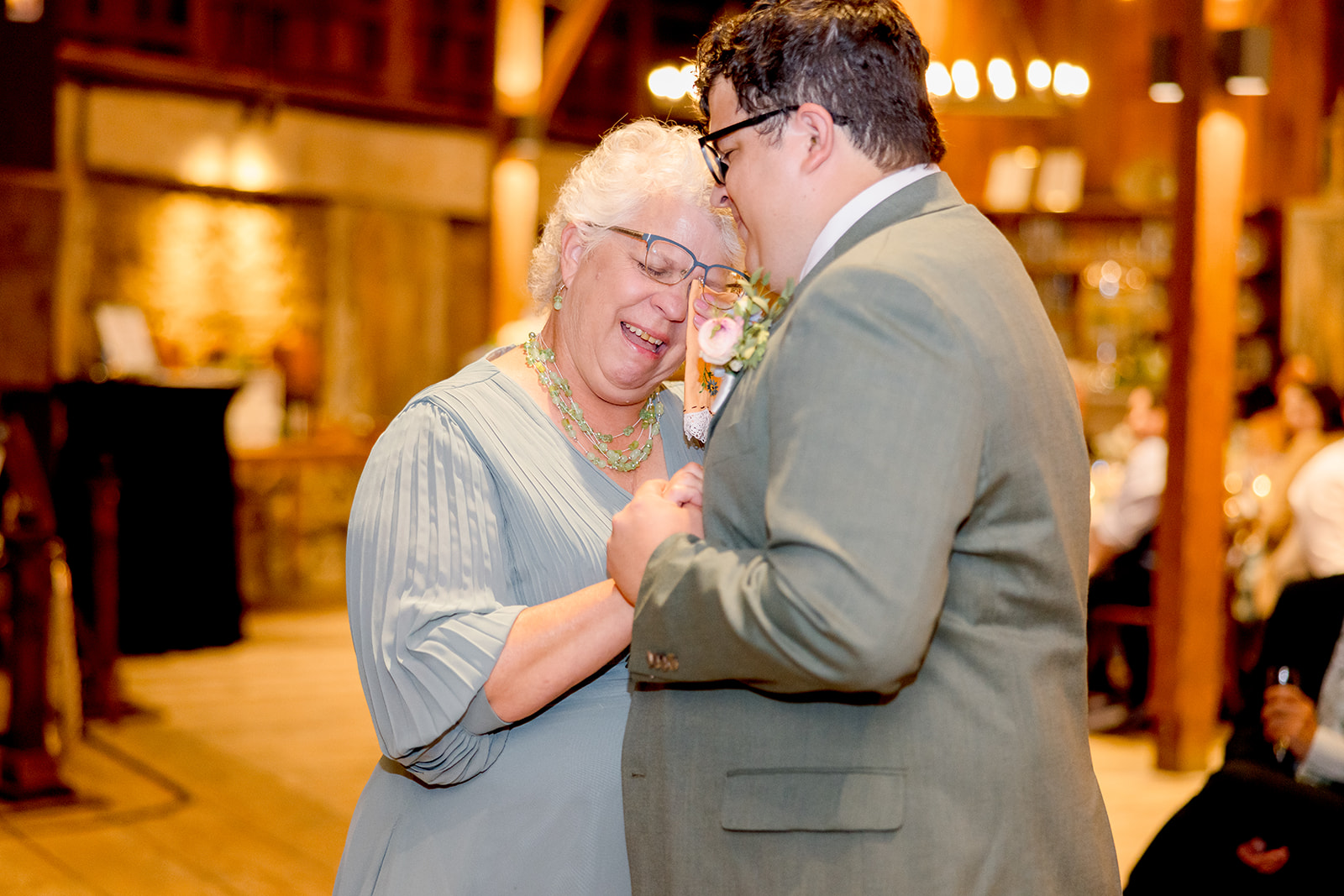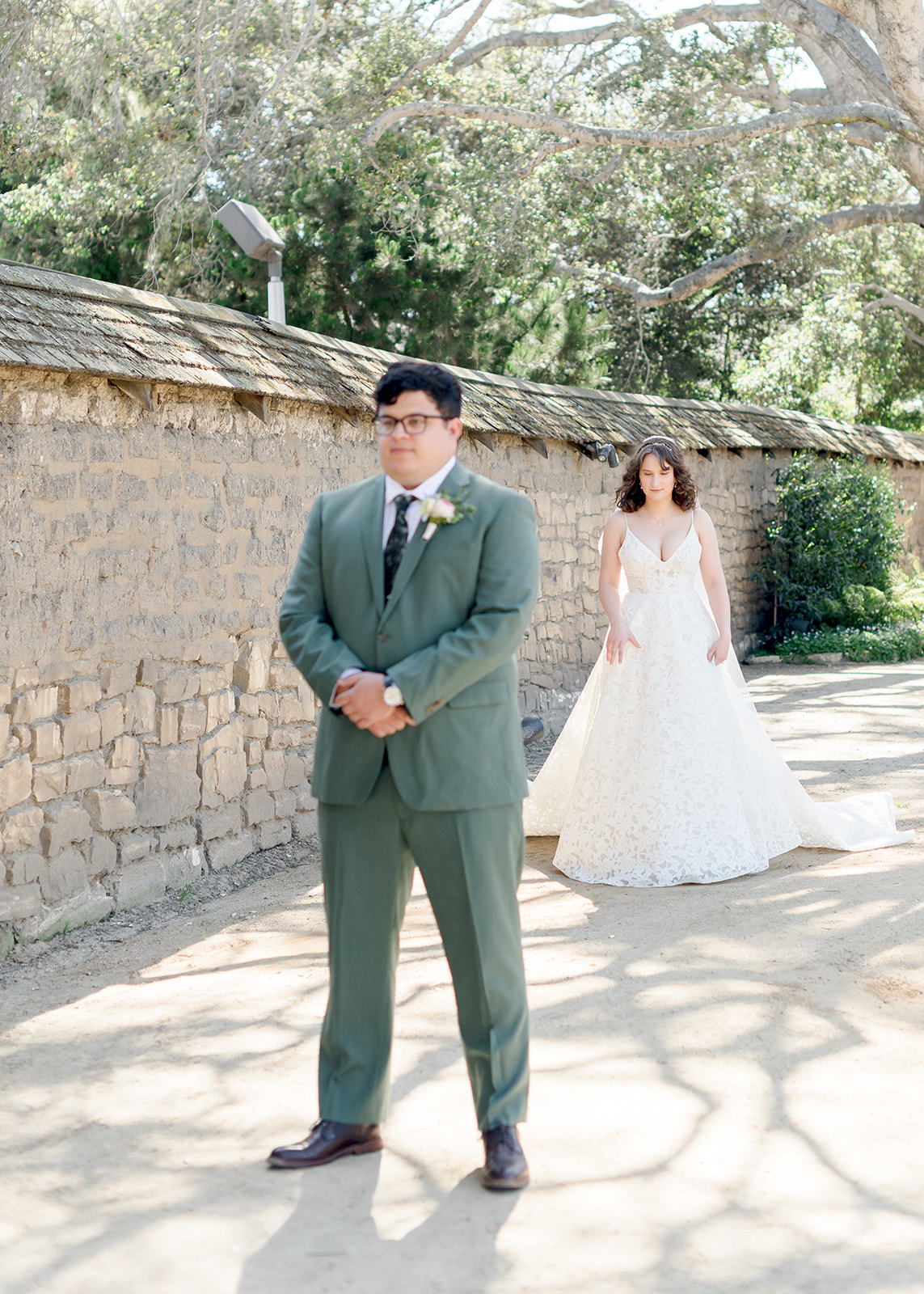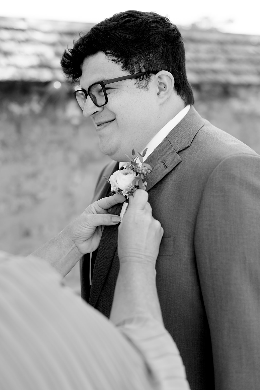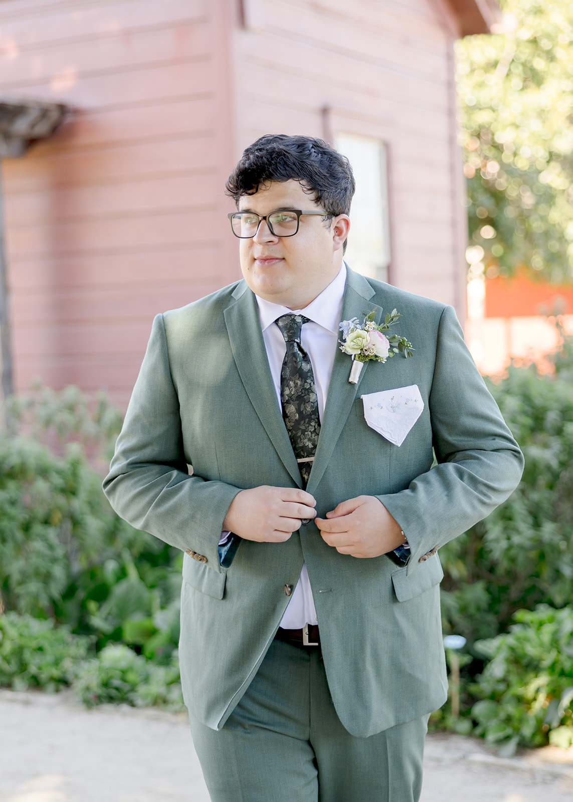 Meanwhile, Esteban wore a dark green suit. It felt timeless and personal to him. His mom, Denise, placed the boutonniere onto his suit jacket right before their first look. It was time for just those two to spend together, and it felt sweet seeing him with his mom and just having a fun and sweet moments together.